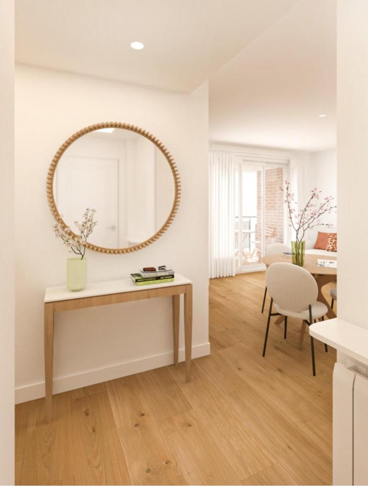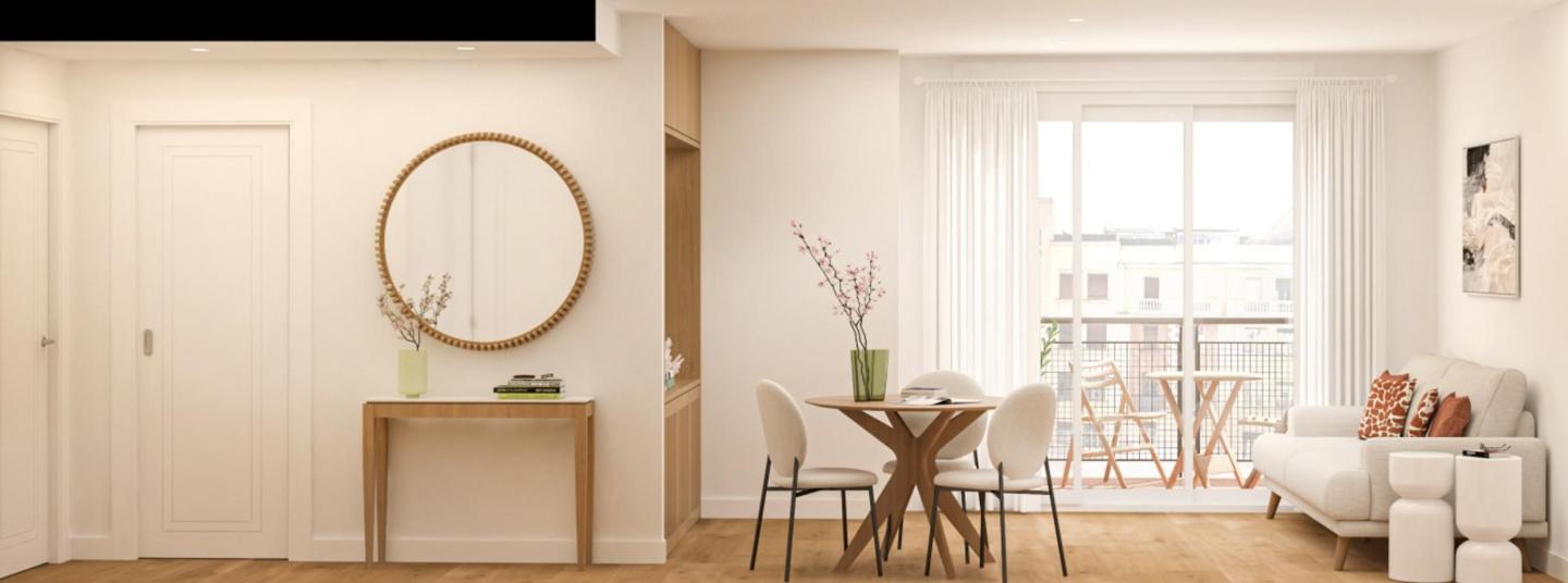 La nueva distribución contempla un salón con cocina americana y acceso directo a la terraza principal, 2 dormitorios, 2 baños (uno en suite) y una segunda terraza con acceso desde el dormitorio secundario. Este piso exterior destaca por su planta cuadrada y sus cuatro ventanas a la calle orientadas al este, que llenan cada estancia de luz natural desde primera hora y durante todo el día gracias a la altura y a la amplitud de la vía. El inmueble dispone de calefacción central, portero físico, dos ascensores y un elegante hall de entrada en la finca.