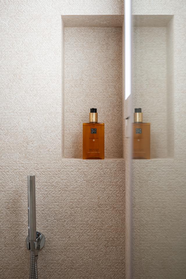 La habitación es grande, pues aparte de la cama de matrimonio, 6 hojas de armarios con diferentes secciones para cada prenda, vestidos en lino e iluminados con led por dentro.