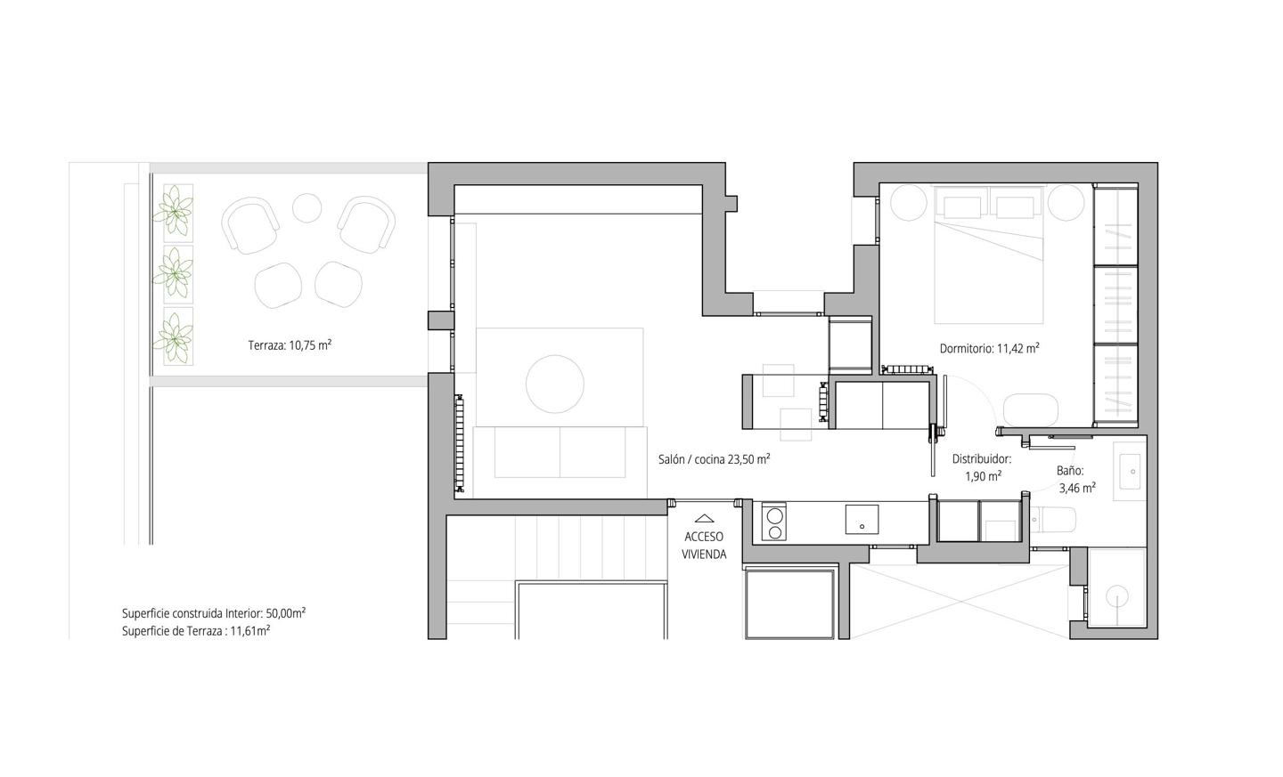 La vivienda, una quinta planta ubicada en una finca clásica con ascensor, destaca por una reforma integral de altísimas calidades, pensada hasta el último detalle para ofrecer el máximo confort, cuenta con un amplio salón con salida directa a la terraza, a la derecha tenemos una cocina totalmente integrada, con una mesa alta llena de luz, armario gabanero y de ropa blanca, dos zonas de cocina completas, luego tenemos un distribuidor con doble armario (escobero y despensa) que da a la habitación y al baño.