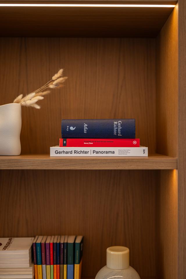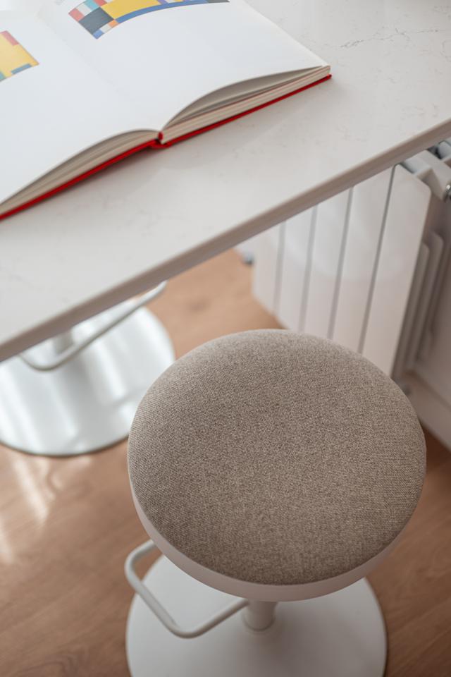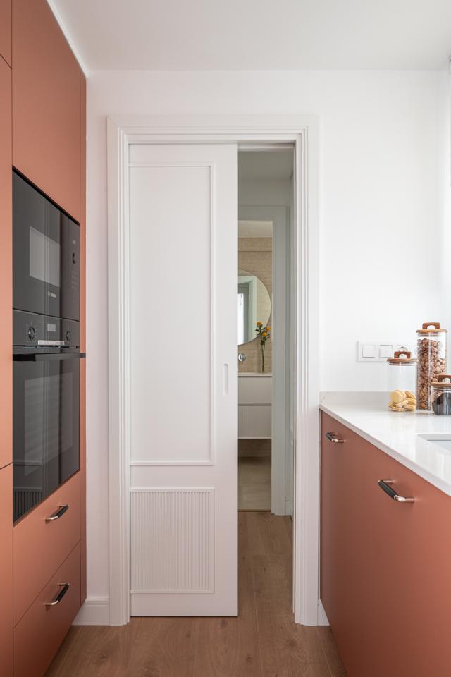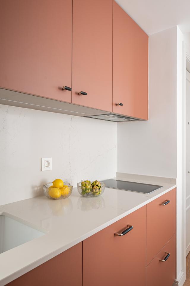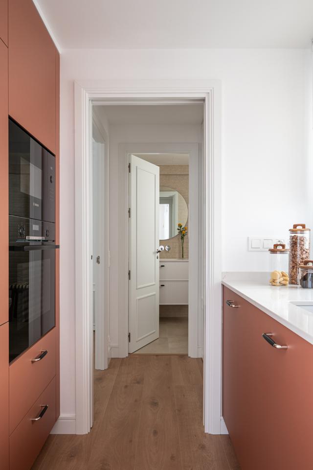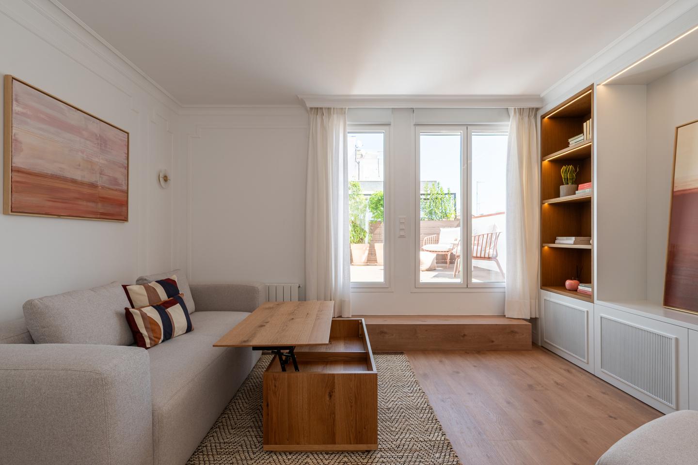 Dispone de un amplio salón muy luminoso, con salida directa a la terraza, y una cocina totalmente integrada, con mesa alta bañada por luz natural, armario gabanero, armario de ropa blanca y doble zona de cocina completamente equipada. Un distribuidor con doble armario (escobero y despensa) da acceso al dormitorio y al baño. El dormitorio, de grandes dimensiones, cuenta con seis hojas de armarios a medida, con diferentes secciones, acabados en lino e iluminación LED interior.