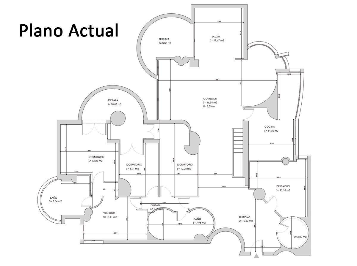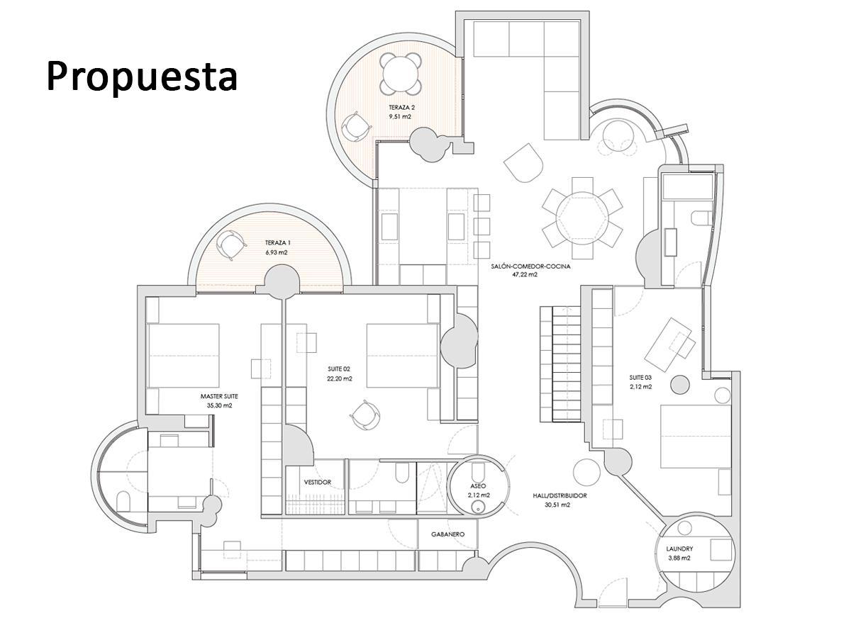 Para ayudarte a imaginarlo, hemos pedido al estudio Arquesta que diseñe una propuesta premium con una redistribución elegante y actual, pensada para sacar todo el partido a la luz, a las circulaciones y revalorizar como nunca los espacios. Esta obra de arte única contaría con 2 habitaciones de más de 20 m2, más una Master Bedroom de 35m2 con baño en suite, todas ellas con vestidor; un enorme salón con cocina americana, un aseo para invitados y cuarto de lavandería. El mismo estudio Arquesta podría realizar la obra para ti o adaptarla a tu gusto si quieres algún cambio. Si quieres conocerla a fondo, estaremos encantados de enseñarte el dossier durante una visita.