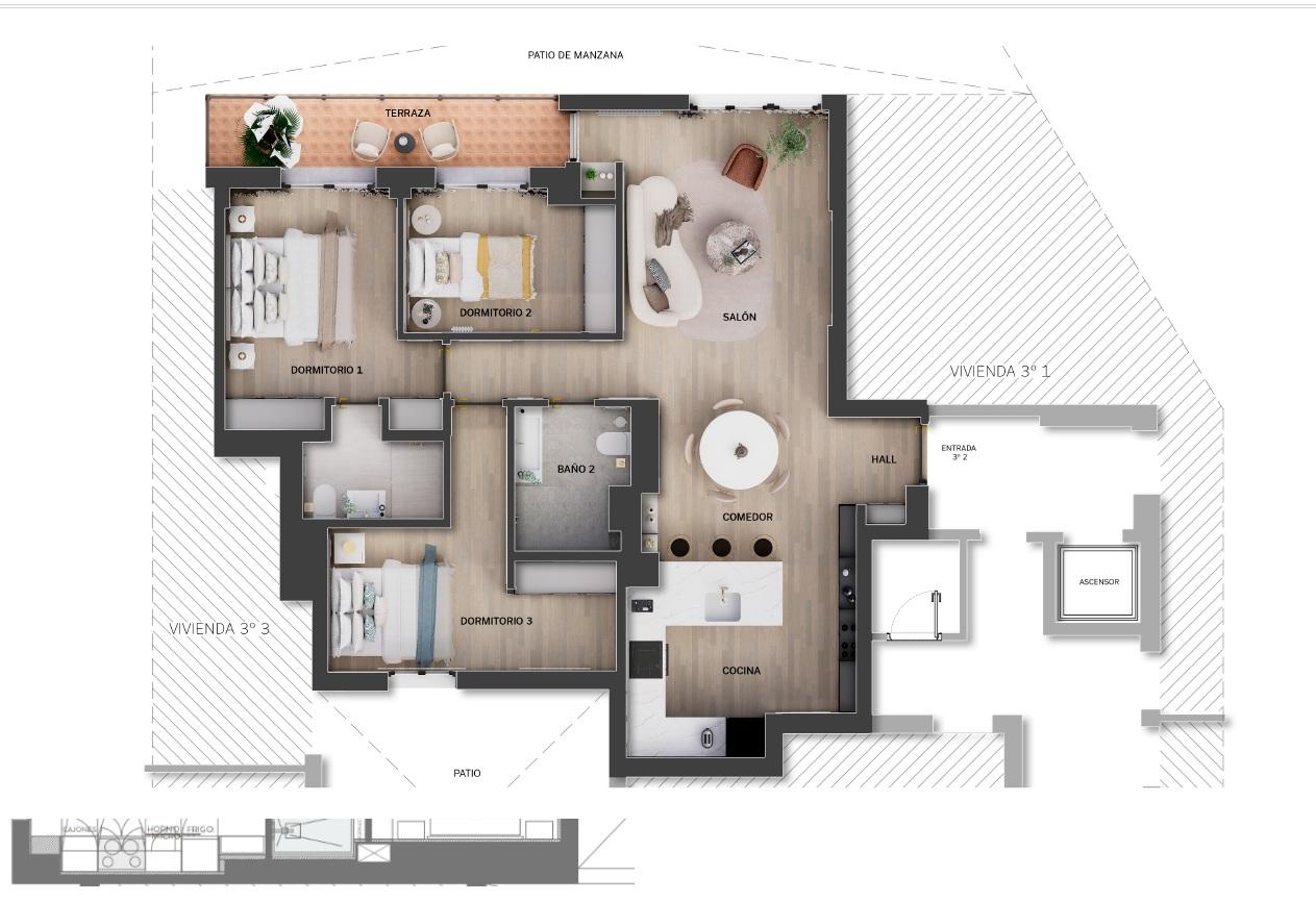 La vivienda ha sido reformada con un planteamiento actual, priorizando la comodidad, la funcionalidad y la luminosidad. Su posición interior a patio de manzana ofrece una atmósfera tranquila, mientras que su orientación sur favorece la entrada de luz natural durante gran parte del día.