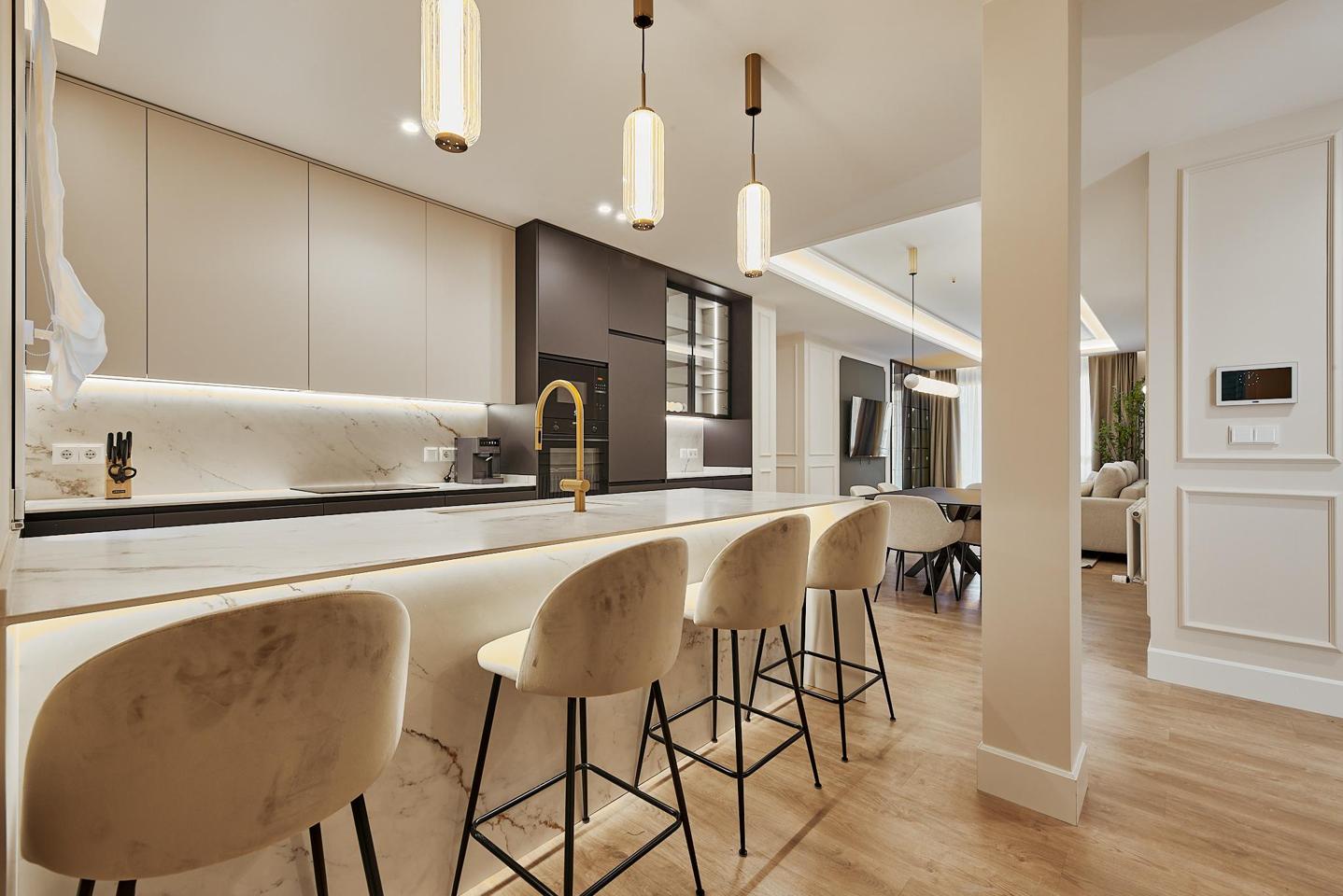 El salón-comedor, espacioso y luminoso, se integra con una cocina completamente equipada, creando un entorno funcional y acogedor tanto para el día a día como para recibir invitados.